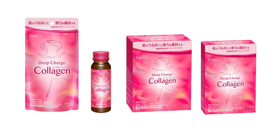 左から、「ディープチャージ コラーゲン」「ディープチャージ コラーゲン ドリンク」「ディープチャージ コラーゲン パウダー」「ディープチャージ コラーゲン ゼリー」(販売価格:264円~3,510円<税込>)